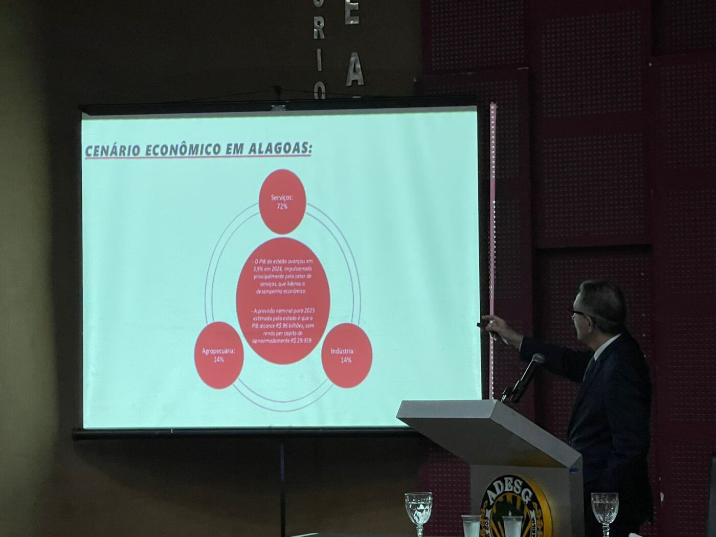 Quando trouxe a análise para o cenário estadual, Luiz Otávio ressaltou que Alagoas apresenta uma realidade distinta, marcada por relativa estabilidade política e fiscal. O estado tem direcionado esforços para políticas sociais e para a articulação de grupos locais no cenário nacional. Do ponto de vista econômico, os serviços são o grande motor da economia, representando cerca de 72% do PIB, com destaque para turismo, comércio, hotelaria e prestação de serviços. O PIB estadual está estimado em R$ 95 bilhões para 2025, o que corresponde a uma renda per capita de aproximadamente R$ 30 mil. Tanto a indústria quanto a agropecuária respondem por 14% do PIB, com a indústria registrando um crescimento médio de 2,5% ao ano. Entre os investimentos estratégicos mais relevantes estão os projetos de energia renovável — incluindo solar e gás natural —, a indústria química com destaque para o PVC e o etanol de segunda geração, além do turismo sustentável estruturado em iniciativas como a Costa dos Corais, o Caminho das Águas e o Sertão. Também merecem atenção os avanços em logística e infraestrutura, com obras de duplicação de rodovias, expansão do saneamento básico e implantação de polos de distribuição. No campo social, programas como o Cartão Cria vêm reforçando a rede de proteção ao complementar o Bolsa Família.